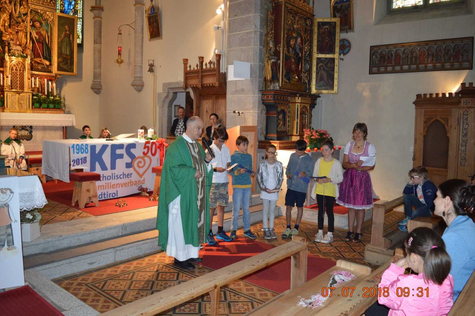 Am Sonntag, 8. Juli, wurde bei einem Festgottesdienst mit dem Familienseelsorger Toni Fiung in der Pfarrkirche von Rein in Taufers das 50-jährige Bestehen der Zweigstelle des KFS Rein gefeiert. Der Gottesdienst stand unter dem Motto „Viele bunte Fäden“, von denen sich jeder Gottesdienstbesucher einen aussuchen konnte. Im Laufe der Messe wurden diese Fäden zu einem bunten Netz verknüpft. Dies sollte sinnbildlich für die starke Vernetzung und den Zusammenhalt in der Familie, in der Gesellschaft und in den Vereinen stehen. Ein Netz kann auffangen, Halt geben, Sicherheit vermitteln und die Zusammengehörigkeit und den Zusammenhalt stärken. Ohne dieses Netz würden viele wertvolle Dienste, viele Tätigkeiten und viele soziale Kontakte nicht möglich sein oder verloren gehen. Dies nimmt sich auch der KFS Rein zu Herzen, der sich mit seiner Tätigkeit an die Familien richtet und sein Netz von den jüngsten bis zu den ältesten Mitmenschen im Dorf spannt. Einmal beim Besuch der Täuflinge mit einer Taufkerze und einem mit Namen bestickten Lätzchen, bei Familiengottesdiensten, Bastelnachmittagen, Seniorenbesuchen in der Weihnachtszeit, bei der Zusammenarbeit mit anderen Vereinen, und vielem mehr…