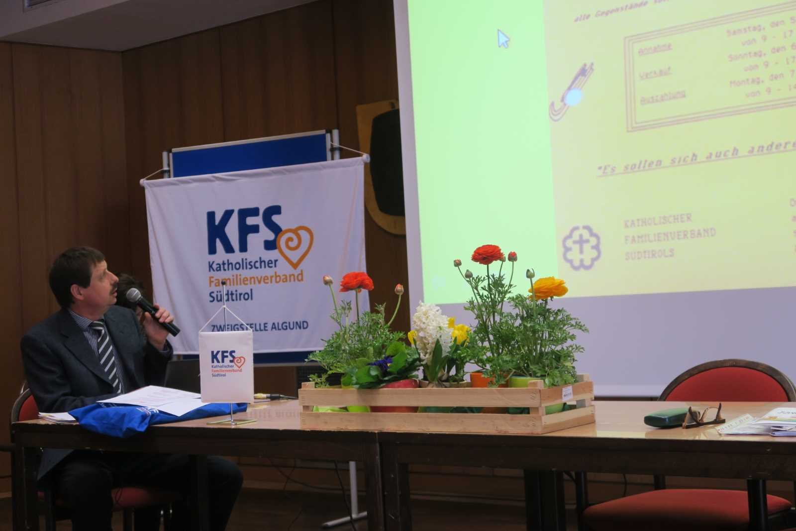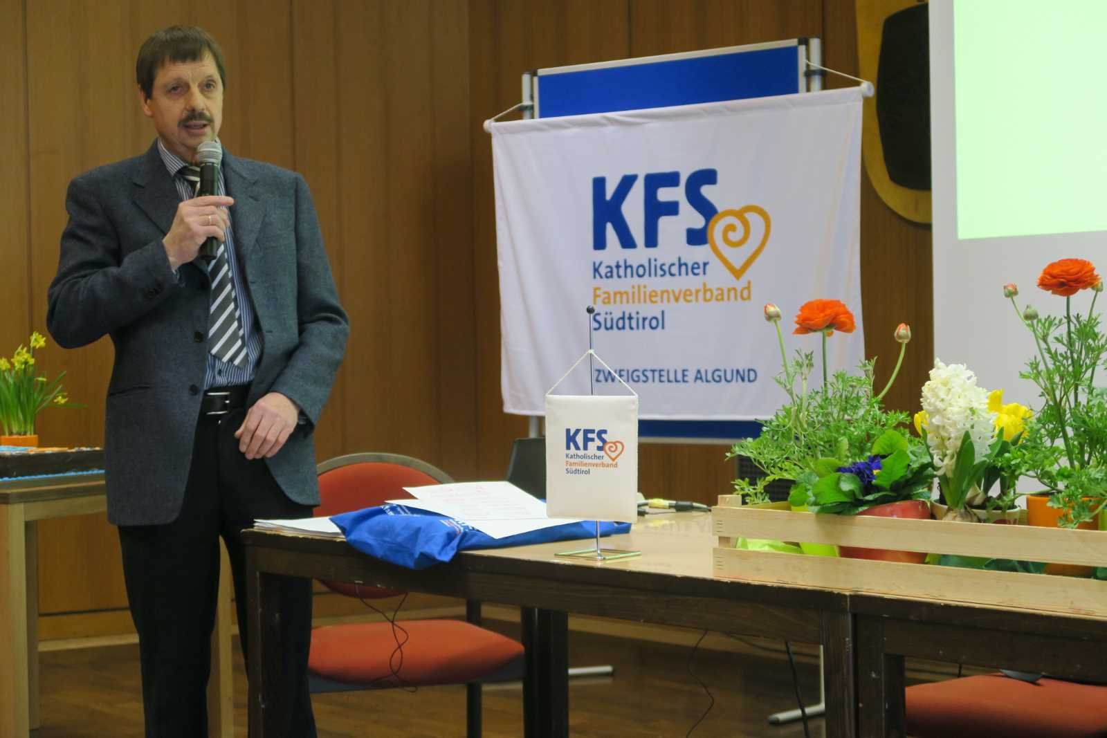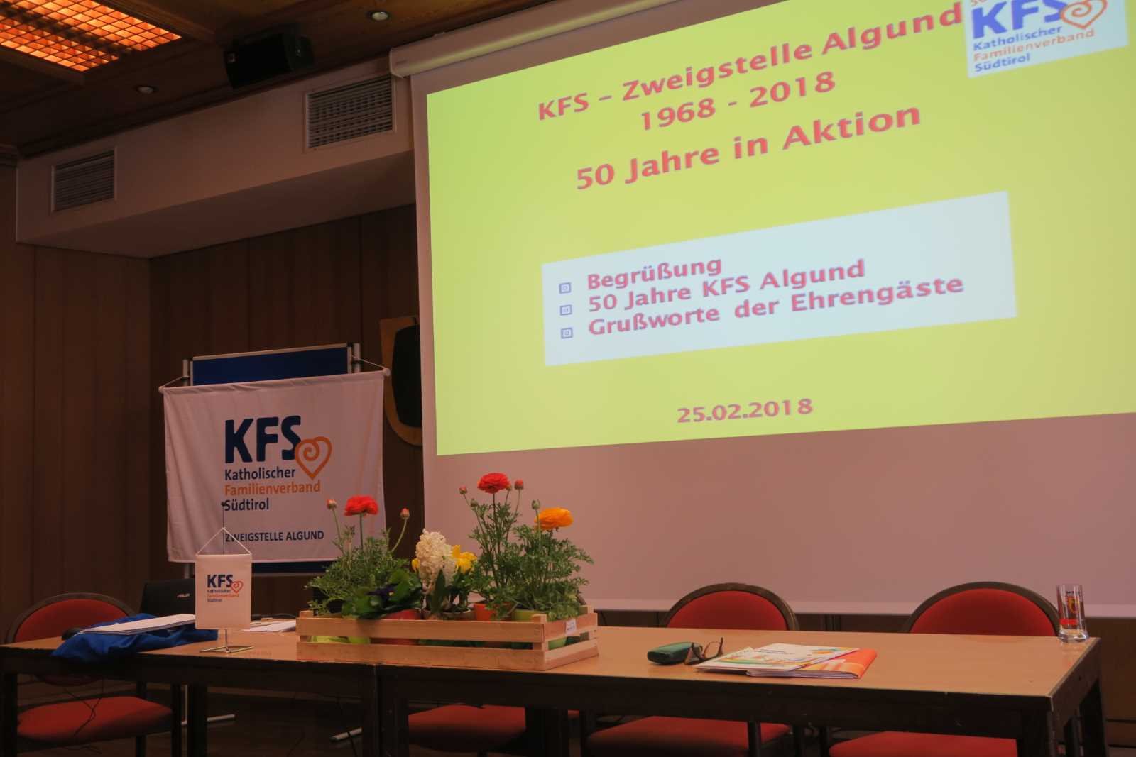"Wenn es in der Familie passt, dann hat die Gemeinde keine Probleme, das Land und auch der Staat nicht", erklärte Bürgermeister Ulrich Gamper, anlässlich des Festaktes. Der KFS-Algund war schon seit jeher bemüht, sich aktiv ins Dorfleben einzubringen. Es gibt kaum ein großes Projekt in der Gemeinde, bei dessen Verwirklichung die Zweigstelle nicht mitgeredet und die Anliegen der Familien nicht vertreten hätte. Sowohl beim Kirchenbau als auch beim Bau des neuen Altenheimes hatte sie eine wichtige Stimme. Der Familienverband setzte sich außerdem dafür ein, dass der Sportplatz für alle offen sein sollte und organisierte die ersten Schülerlotsen im Dorf. Seit 2006 gibt es die Spielegruppen und auch die Sommerbetreuungswochen bieten jedes Jahr spanndende Abenteuer und Erlebnisse für die Kinder im Einzugsgebiet. Seit der Gründung bis ins Jahr 2013 war Algund eine der wenigen Zweigstellen, in der sich vor allem Männer im Ausschuss einbrachten. Mittlerweile ist die Zweigstelle in weiblicher Hand.