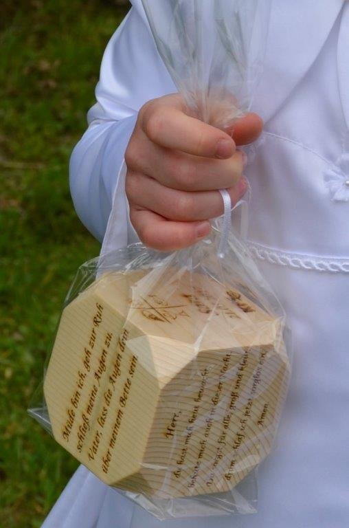 Dieses Jahr hat sich der KFS Winnebach für die Erstkommunionkinder etwas ganz Besonderes einfallen lassen. Jedem Kind wurde ein Gebetswürfel überreicht. Die Kinder hatten eine besondere Freude damit, weil neben einigen Kurzgebeten auch ihr eigener Name mit dem Datum der Erstkommunion eingraviert worden ist.