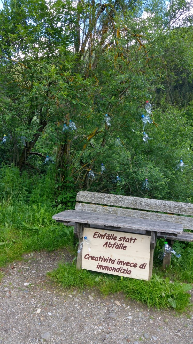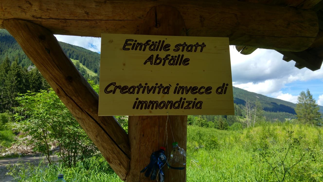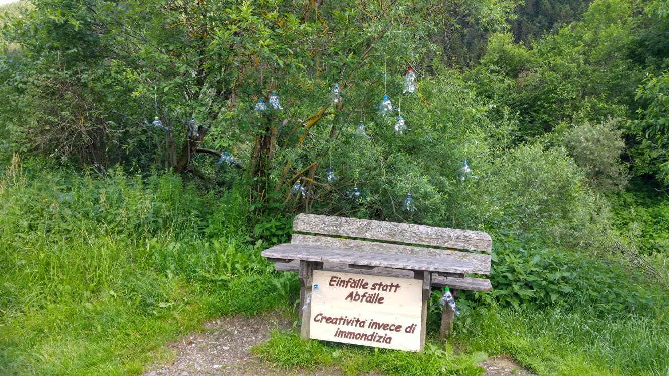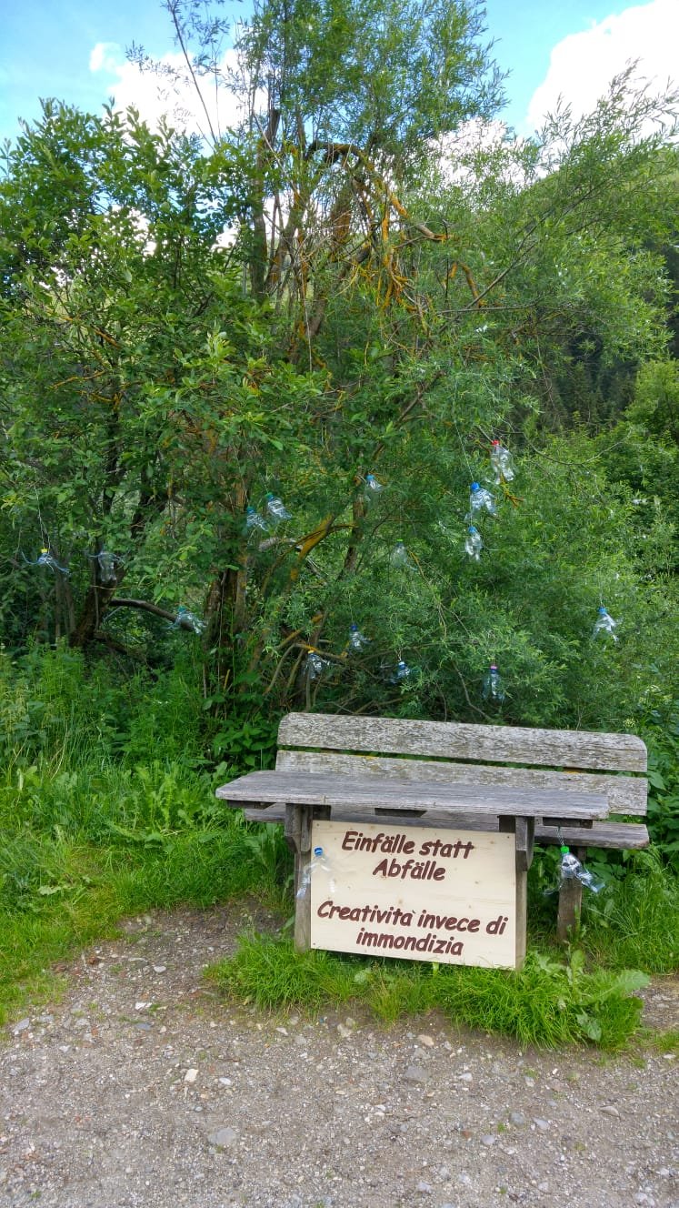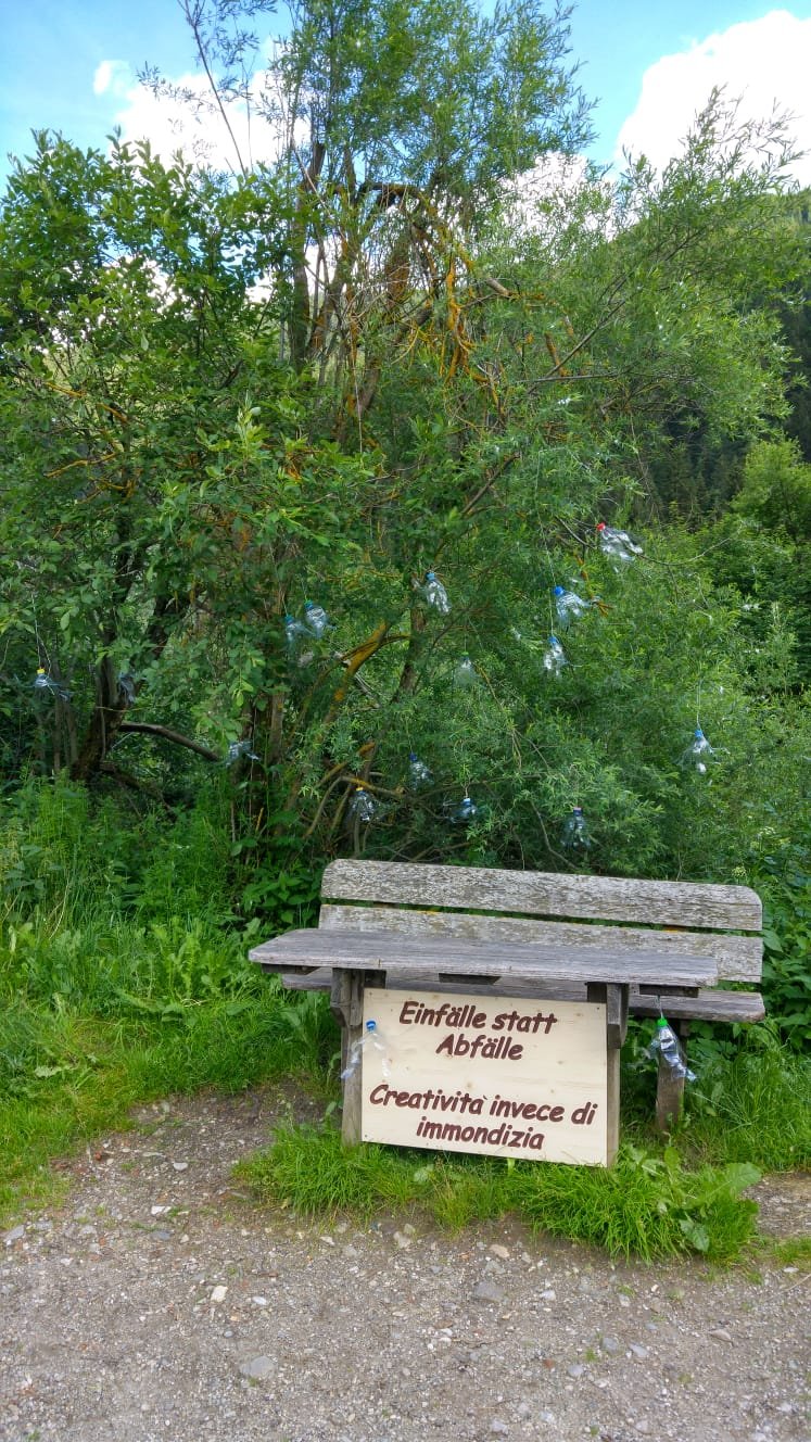 Wir, vom KFS Winnebach, bastelten aus Plastikflaschen Spinnen, die wir dann an zwei Stellen entlang des vielbefahrenen Fahrradweg Richtung Lienz aushingen. Es wurde noch die Aufschrift „Einfälle anstatt Abfälle – Creatività invece di immondizia“ angebracht. So sollten auch die Touristen zum Thema „Plastikmüll“ sensibilisiert werden und nicht alles entlang des Fahrradweges wegwerfen.