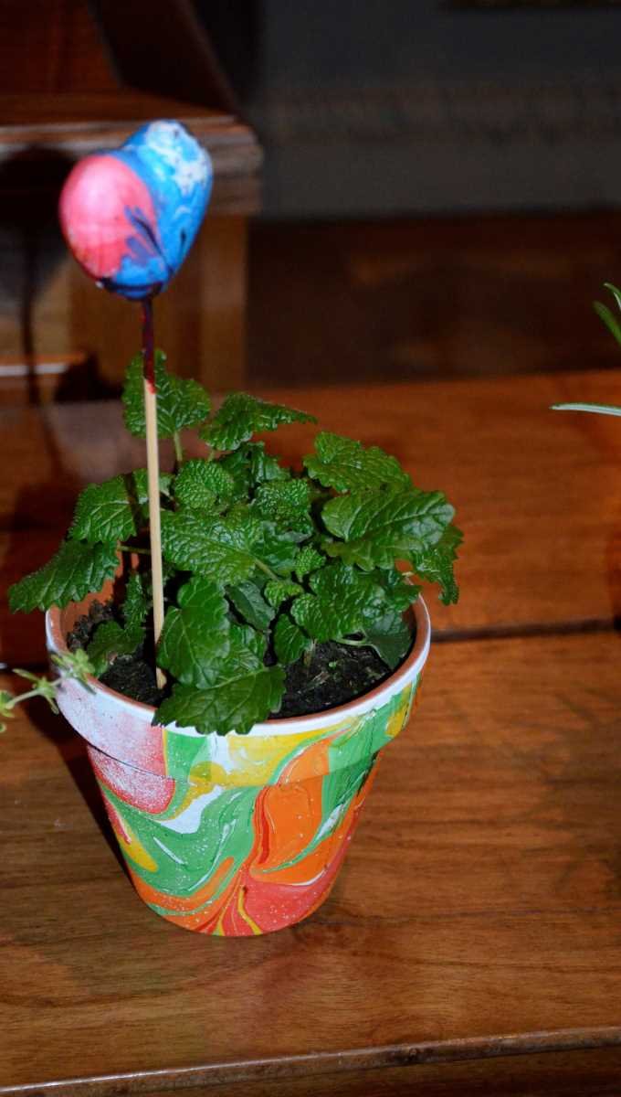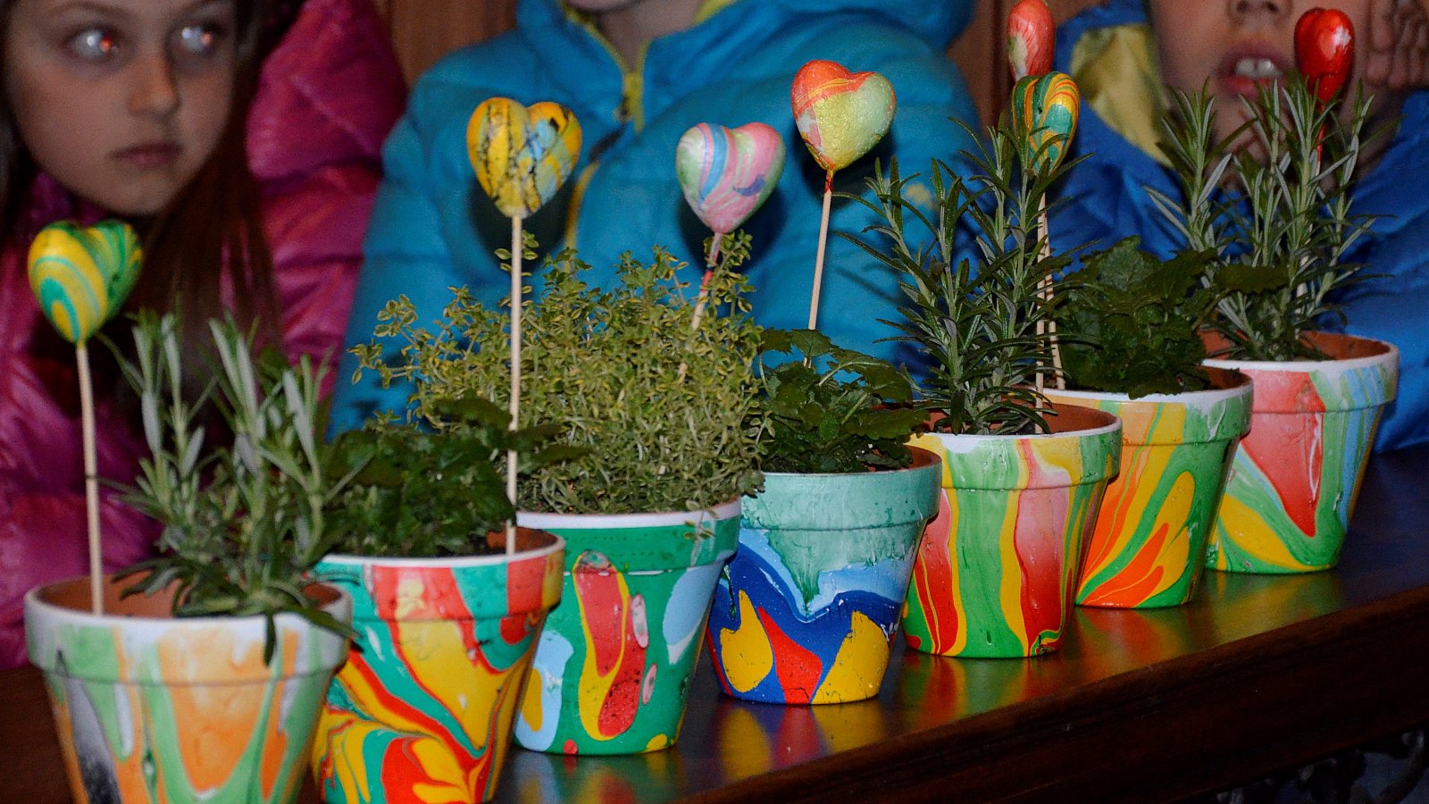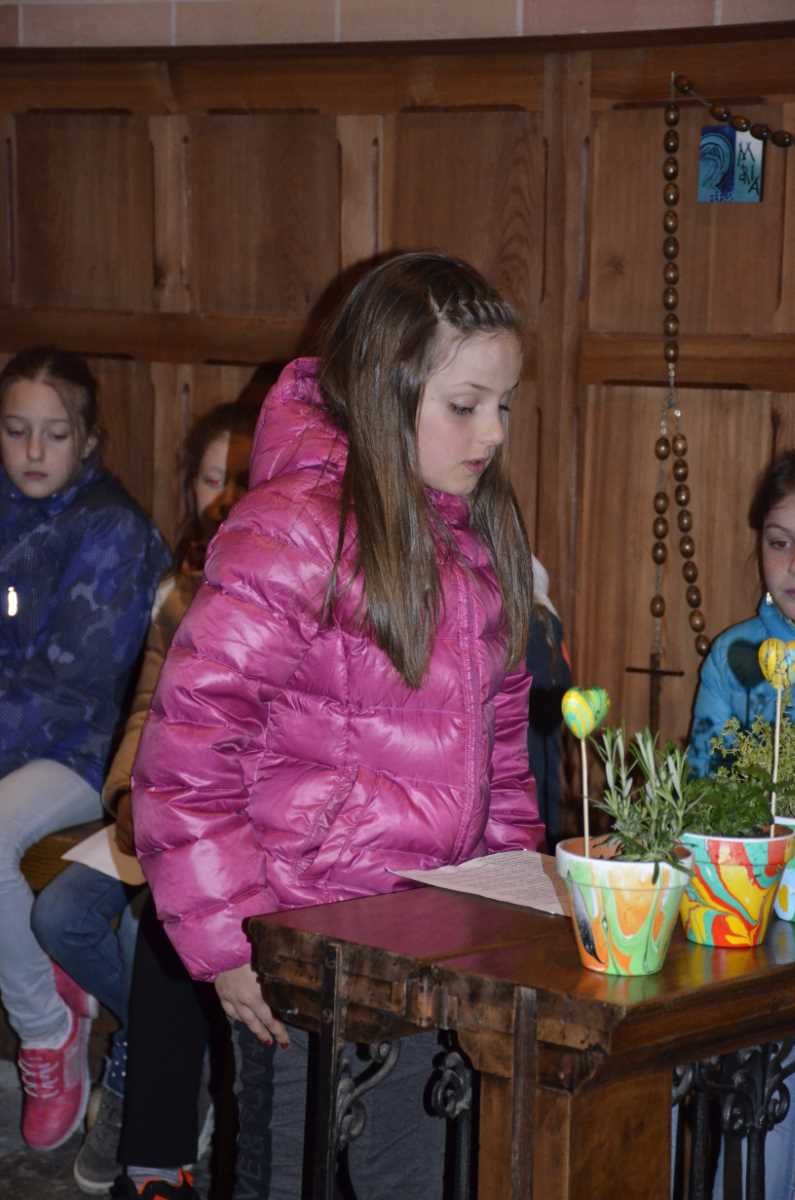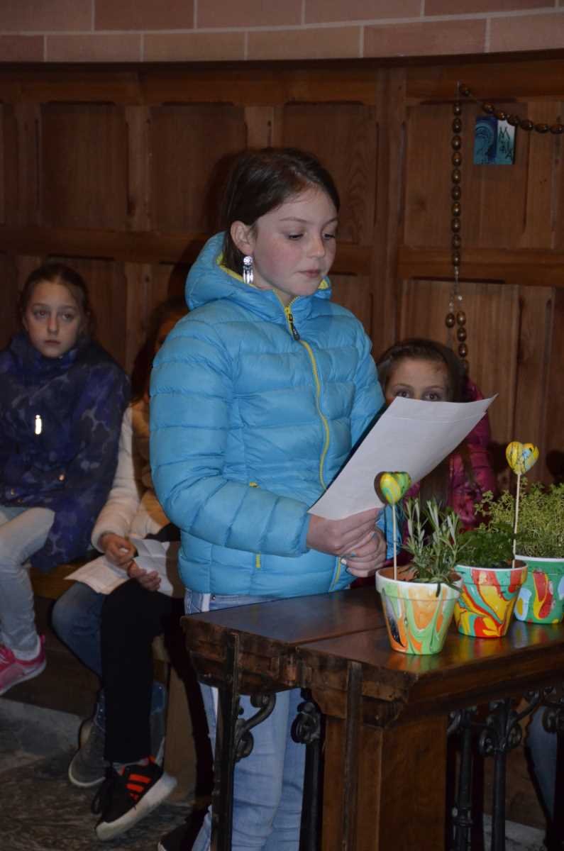 Am Abend des gleichen Tages gestalteten wir noch die Maiandacht zu Loreto. Im Mittelpunkt der Andacht stand natürlich Maria, die Mutter Jesu. Die Kinder trugen abwechseln wunderschöne Texte vor. Nach und nach wurde ein Buchstabe aufgestellt. Bis zum Schluss ergaben die Buchstaben den Namen Maria. Musikalisch umrahmt wurde die Andacht von Julia Rainer, Lisa Klocker und Martin Gasser. Im Anschluss an die Andacht durften wir allen Müttern und Frauen eine marmorierte Rosmarin-, Zitronenmelisse- oder Zitronenthymian-Tonvase mit Einsteckherz überreichen.