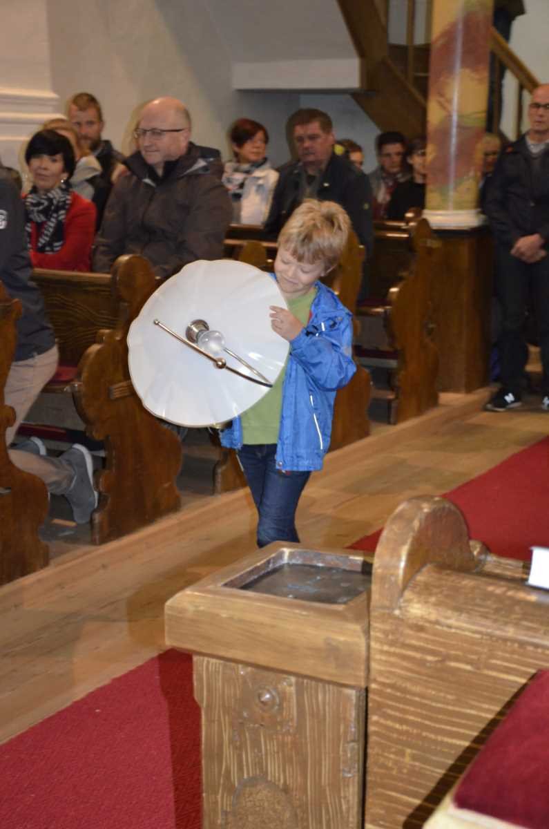 Zusammen mit Priester Peter Kocevar wurde die Messe einmal etwas anders gestaltet. Der mitgebrachte Regenschirm, der Lampenschirm, der Sonnenschirm und der Fallschirm wurden zum Symbol für Gott bestimmt. Gott ist für uns wie ein Schirm, um schlechtes Wetter und schlechte Zeiten zu überstehen, Dinge in einem anderen Licht zu sehen, im Schatten neue Kraft zu finden und ein Schirm der uns auffängt, wenn wir einmal fallen. Im Verlauf dieser Messe segnete Priester Peter Kocevar auch noch unsere selbstgemachten Weihwasserkrüglein vom April und am Ende der Messe wurden an alle Anwesenden kleine Schirme mit einem kurzen Gebet verteilt. Der Frauenchor „Flott Xung“ aus Sand in Taufers umrahmte die Messe musikalisch.