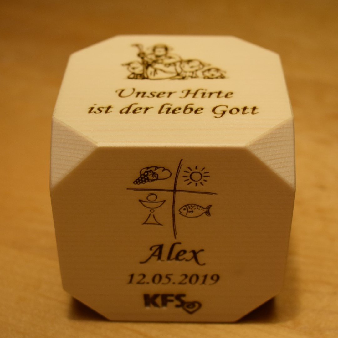 Am Sonntag, den 12. Mai fand in Winnebach die Erstkommunion statt. Zu diesem besonderen Anlass überreichte der Familienverband den Erstkommunionkindern Alex, Cecilia, Giorgia und Hubertus einen Gebetswürfel. Am Würfel waren – passend zum Thema der Erstkommunion „Unser Hirte ist der liebe Gott“ – kurze Gebete eingebrannt.